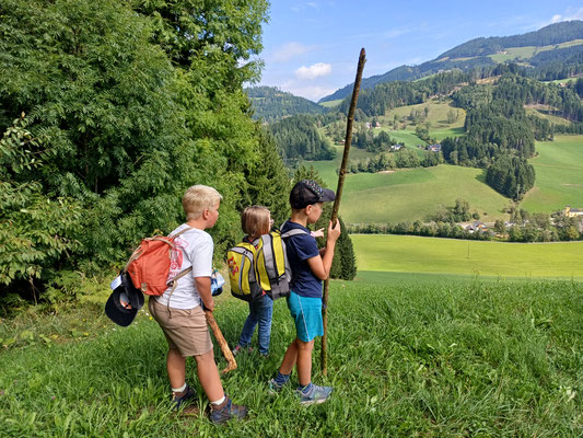 Wald. Bei diesem Erkundungsmarsch lernten die Kinder vieles über Bäume und Pflanzen im heimischen Wald, aber auch Tiere waren ein Thema. Die Kinder durften eigene Erfahrungen einbringen und bei
